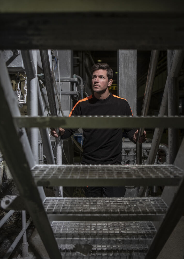 Långärmad t-shirt i bomull med fluorescerande tyg över axlarna. Modern passform. Halsringningen är dubbelsidig, även förstärkt med nackband för extra slitstyrka. Mudd i ärmslut.