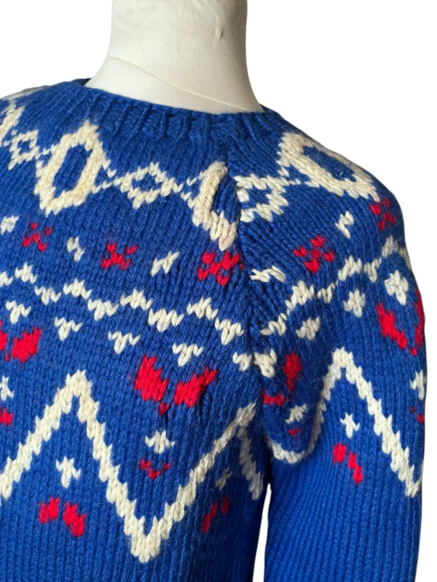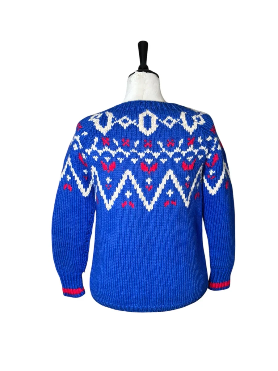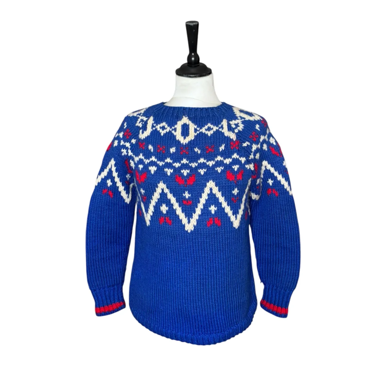 Blå grovstickad tröja med vitt och rött mönster. Hemmastickad. Storlek: XS-S Bystmått: 46 cm Längd: 60 cm Material okänt (hemmastickad)