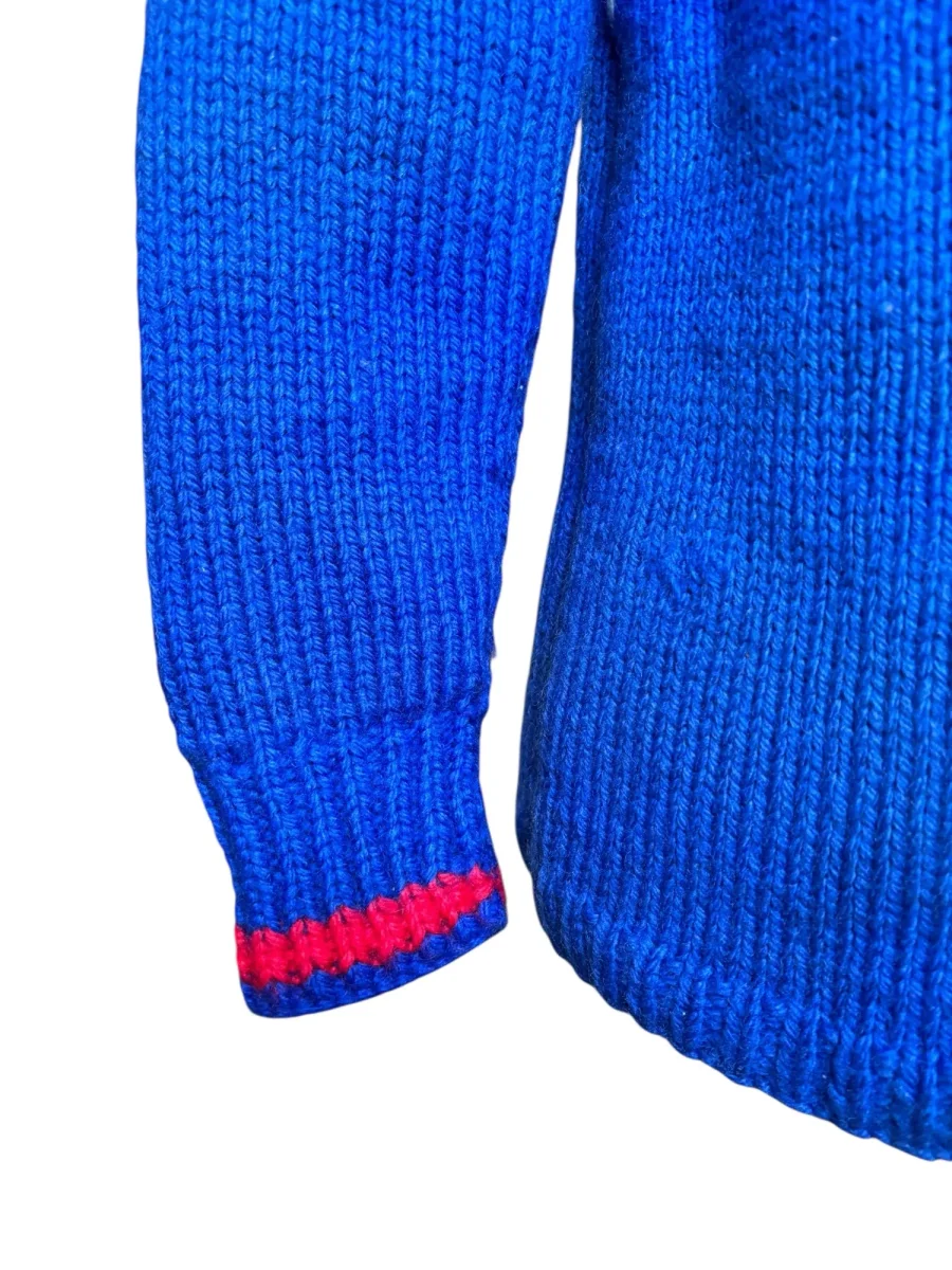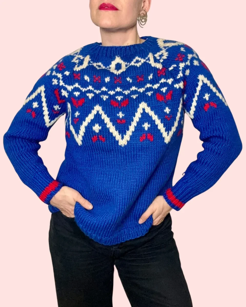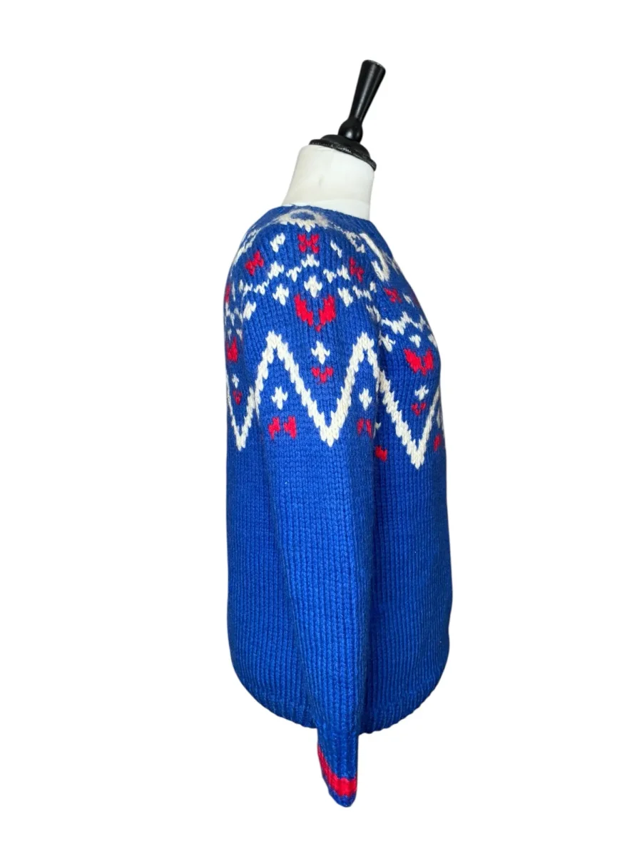 Blå grovstickad tröja med vitt och rött mönster. Hemmastickad. Storlek: XS-S Bystmått: 46 cm Längd: 60 cm Material okänt (hemmastickad)
