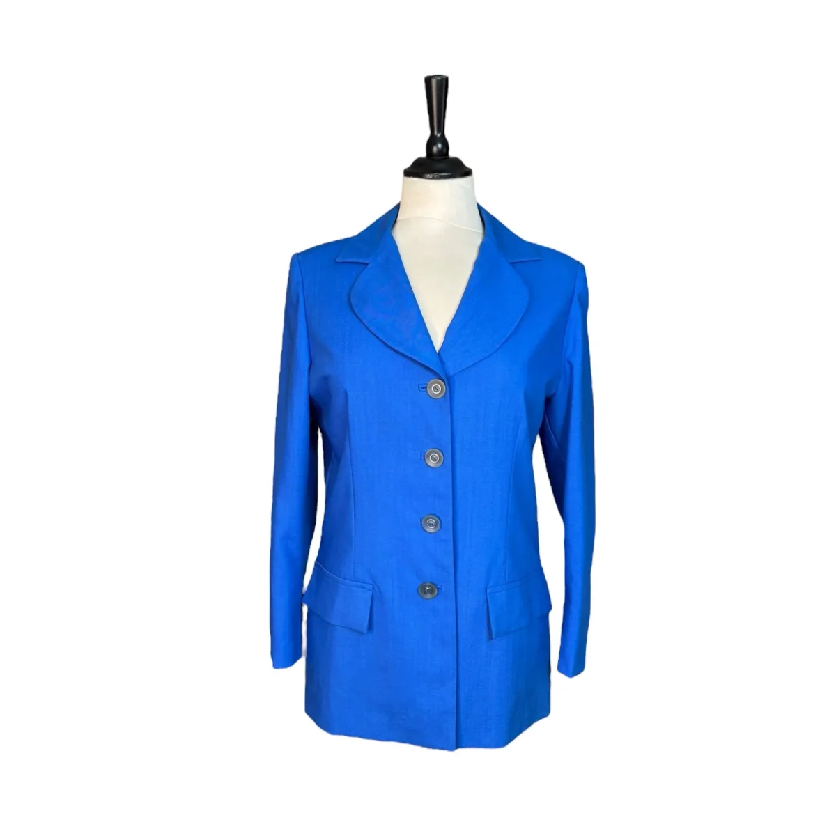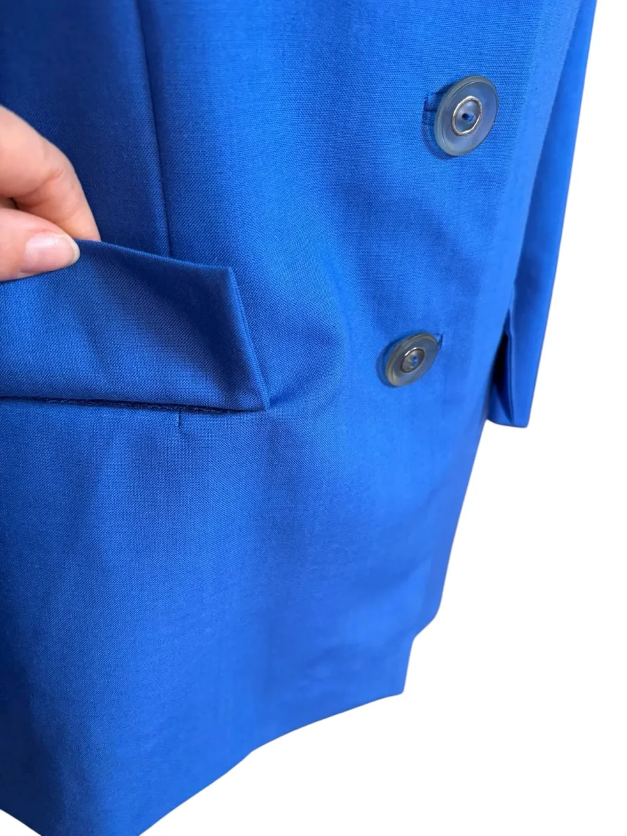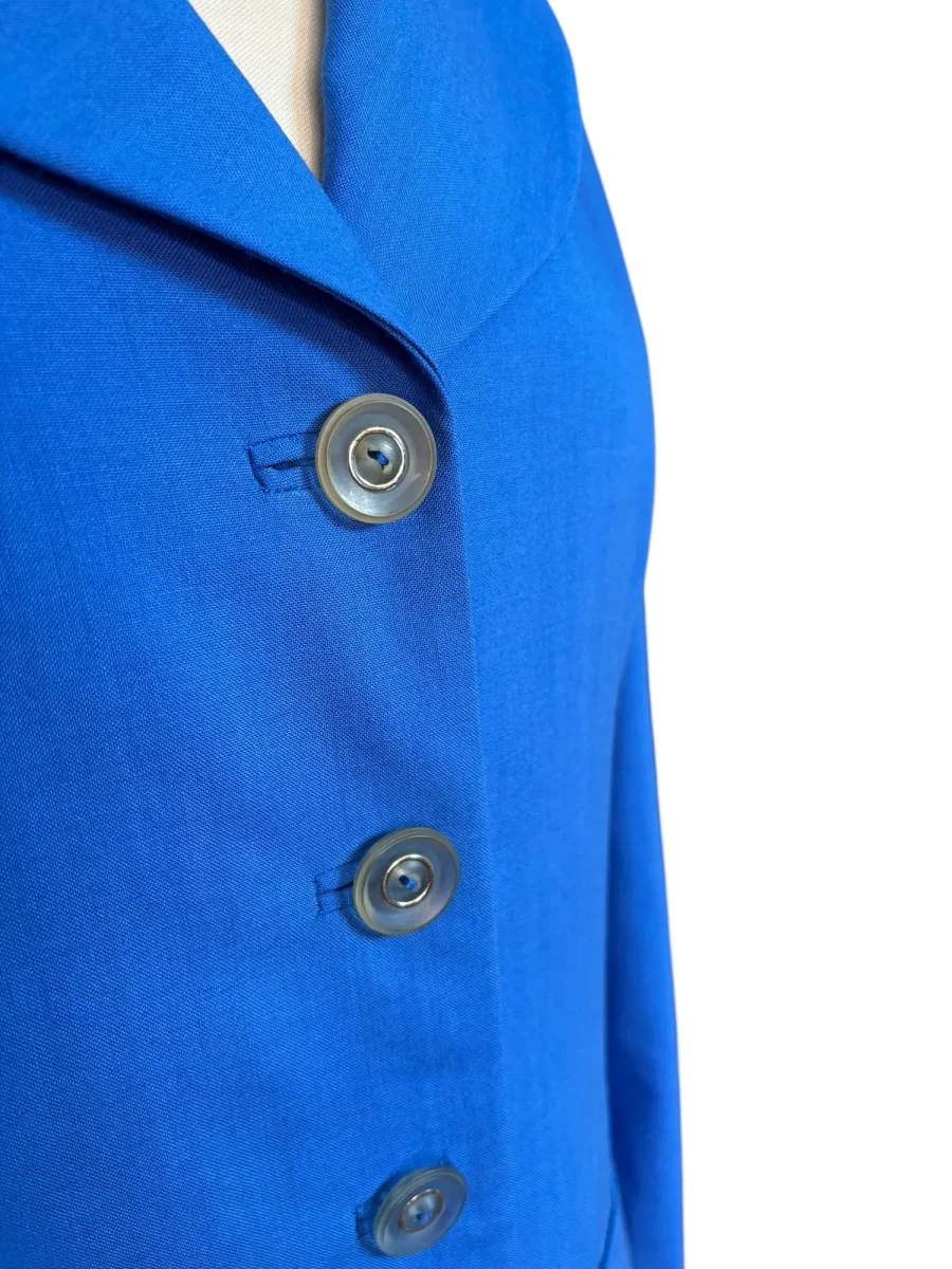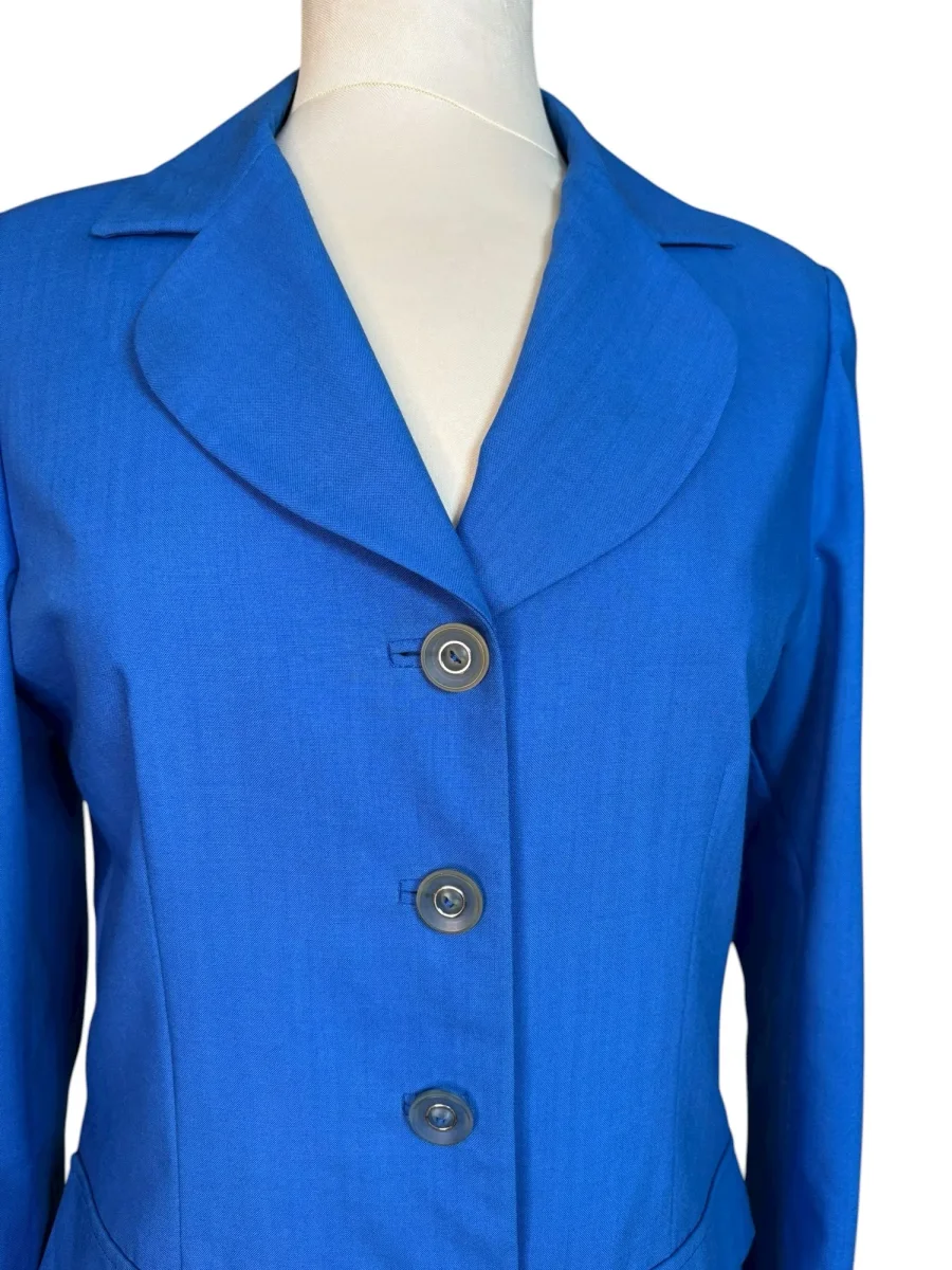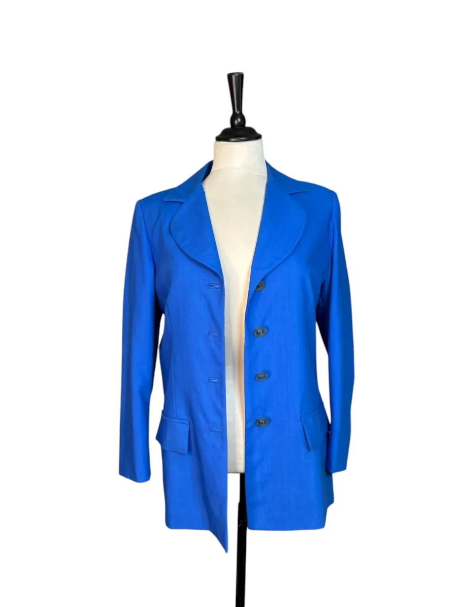 Blå vintagekavaj med rundade slag. Tunt och fint material och helfodrad med insydda axelvaddar. Storlek: ca S Bystmått: 48 cm Axelmått: 40,5 cm Ärmlängd: 58 cm Längd: 67 cm Material: okänt