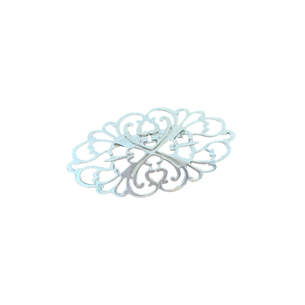 Större brosch i oval snirklig form. Bredd: 7,5 cm Höjd: 4 cm Material okänt