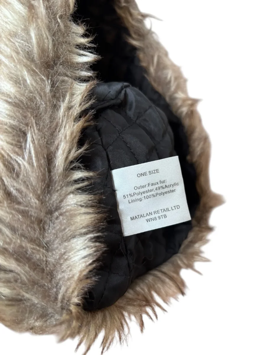 Mysig brun fuskpälsmössa. Omkrets: 59 cm Material: 51% polyester, 49% akryl Foder: polyester