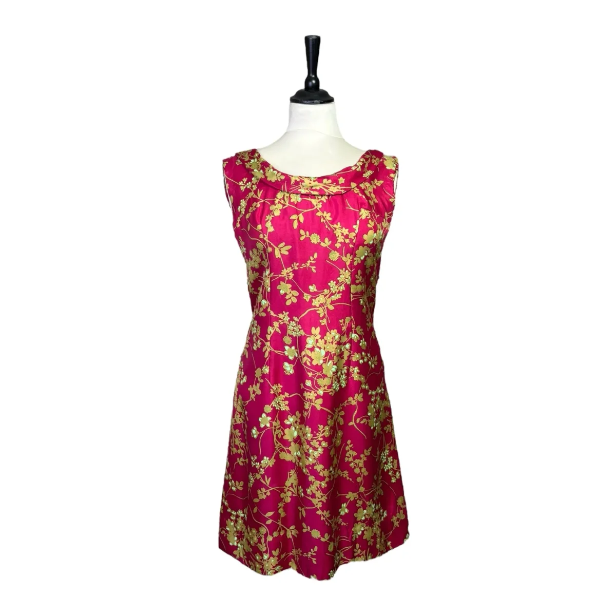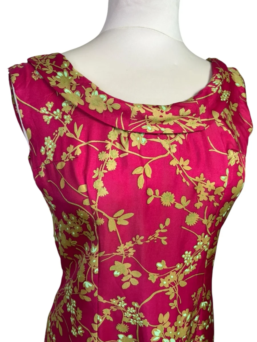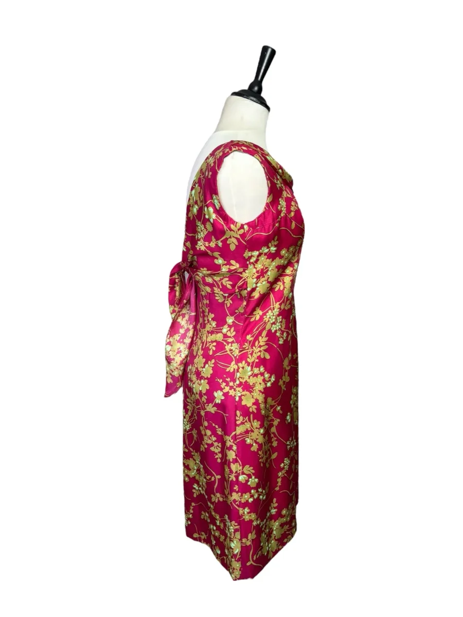 Ljuvlig hemmasydd klänning, troligen 60-tal. Lätt figursydd med djup ringning i ryggen med dekorativt knytband. Dragkedja i ryggen. Ceriserosa mot det vinröda hållet med beigebruna blommor. Storlek: ca S Bystmått: 47 cm Midjemått: ca 74 cm Längd: 93 cm Material okänt (känns som silke)
