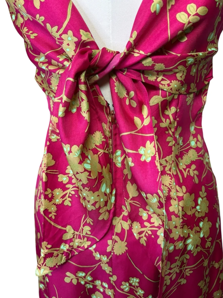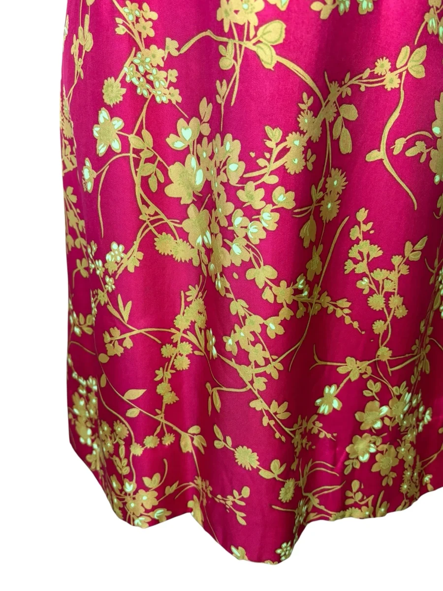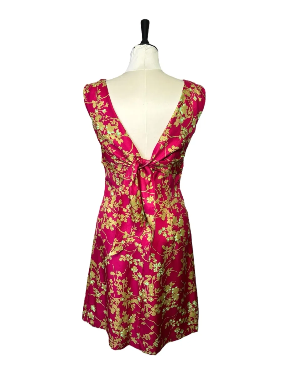 Ljuvlig hemmasydd klänning, troligen 60-tal. Lätt figursydd med djup ringning i ryggen med dekorativt knytband. Dragkedja i ryggen. Ceriserosa mot det vinröda hållet med beigebruna blommor. Storlek: ca S Bystmått: 47 cm Midjemått: ca 74 cm Längd: 93 cm Material okänt (känns som silke)