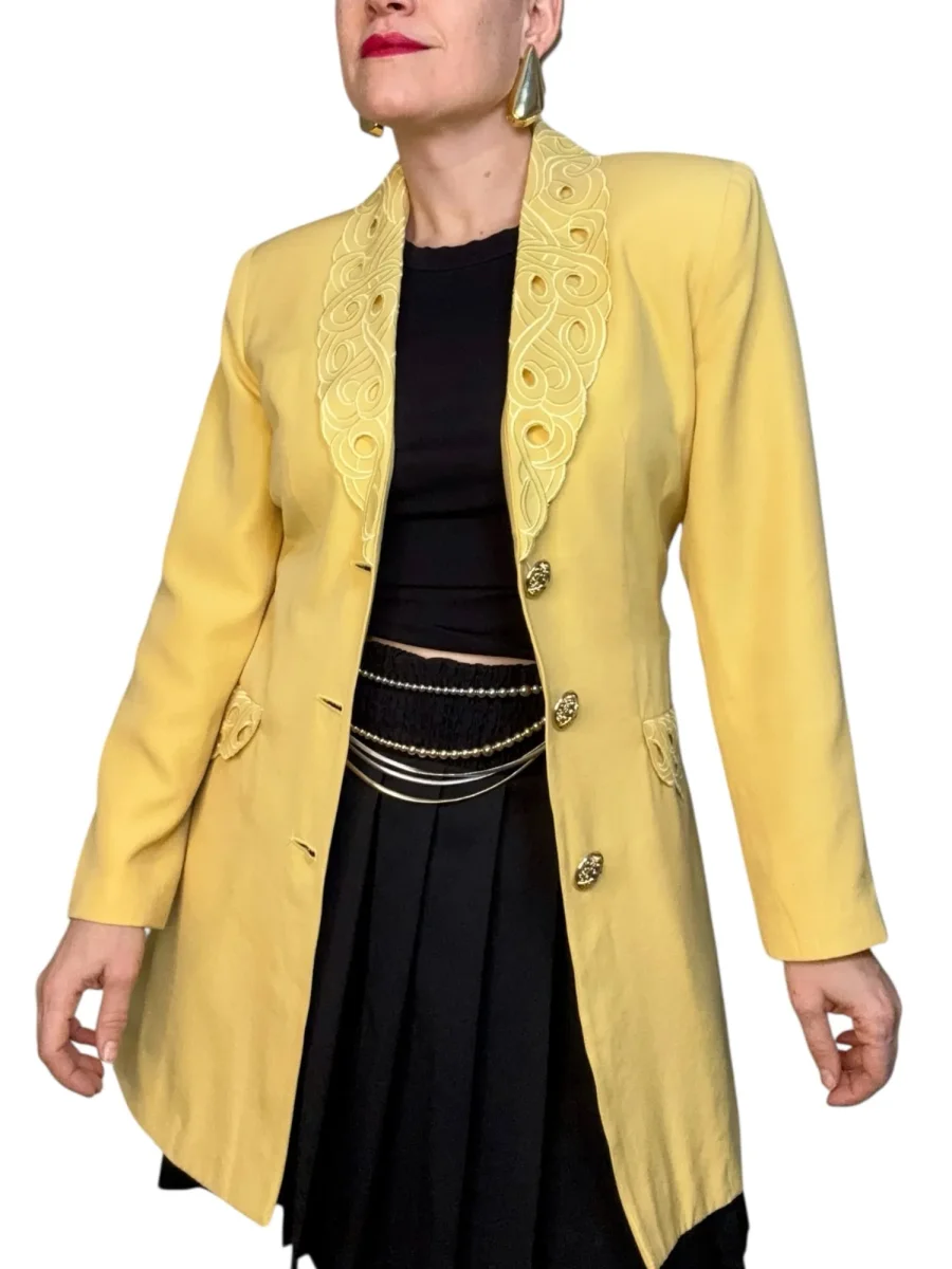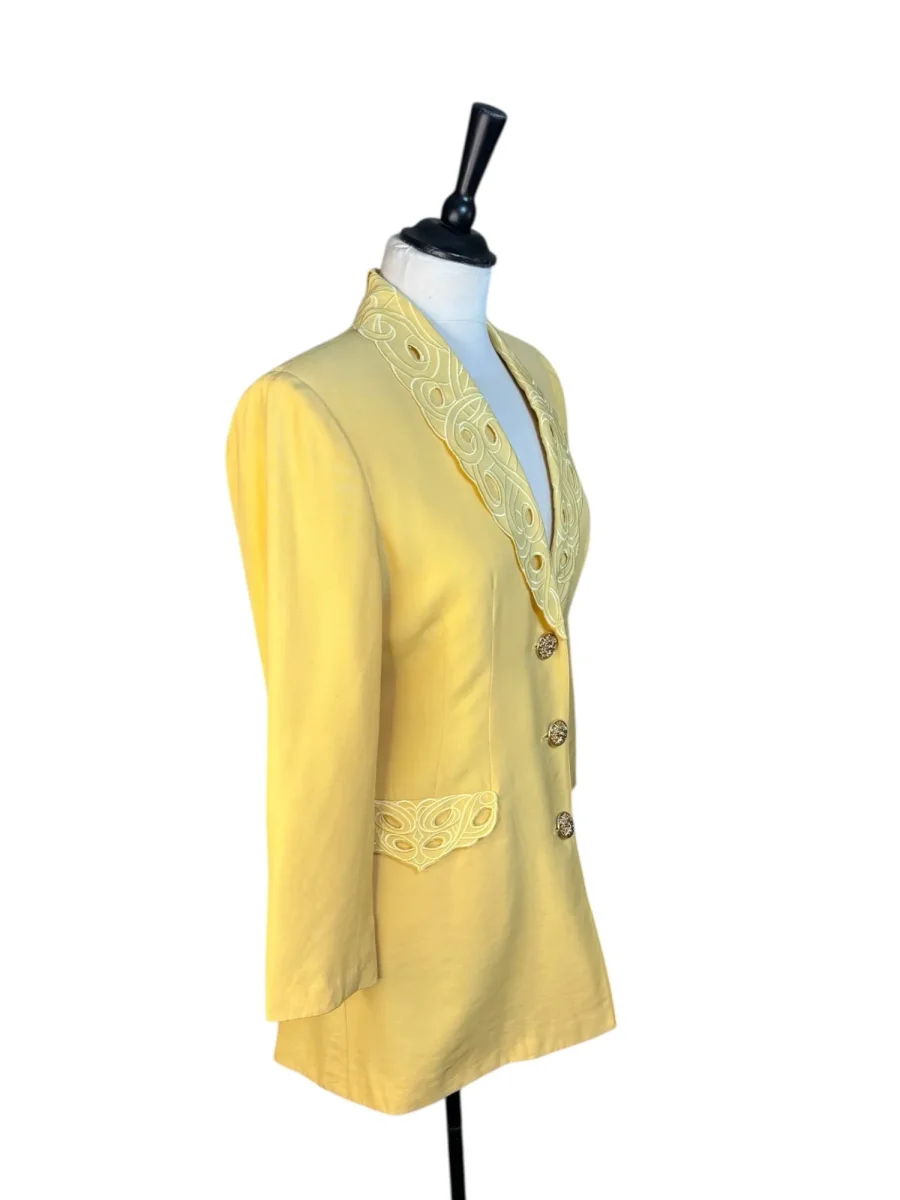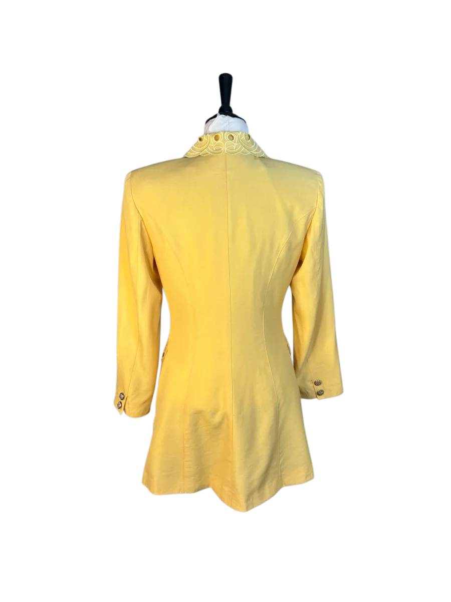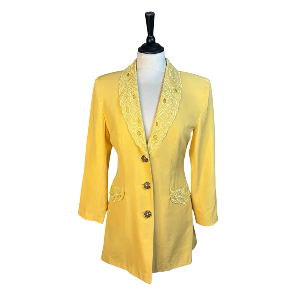 Gul längre och figursydd kavaj i härlig gul färg. Rejäla axelvaddar och fina utskurna detaljer på krage och fickor. Storlek: XS (italiensk 42) Bystmått: 45 cm Axelmått: 41 cm Ärmlängd: 56 cm Längd: 79 cm Material: 65% ull, 35% viskos Material, foder: okänt