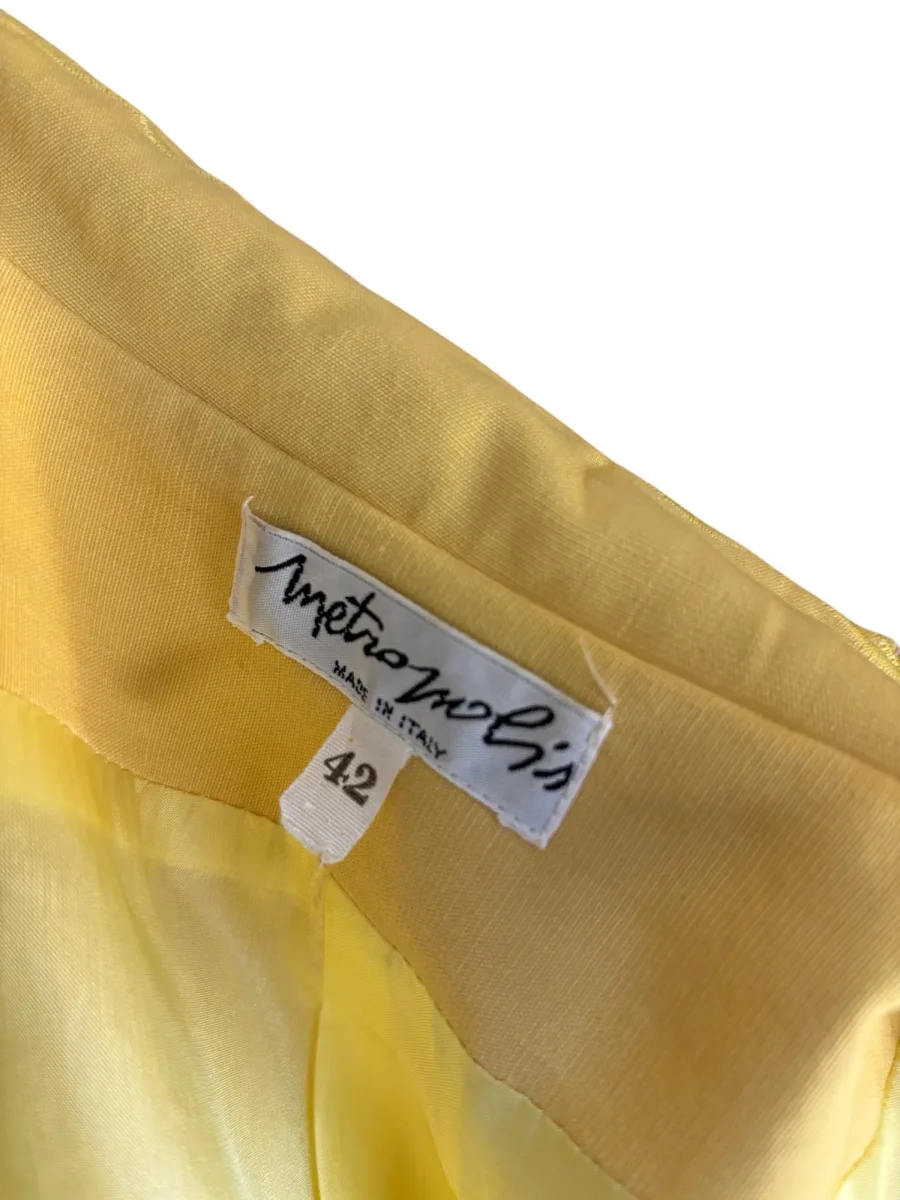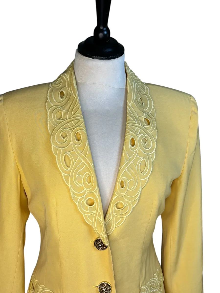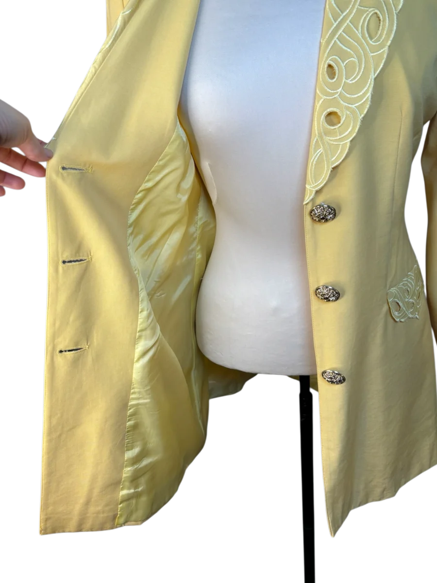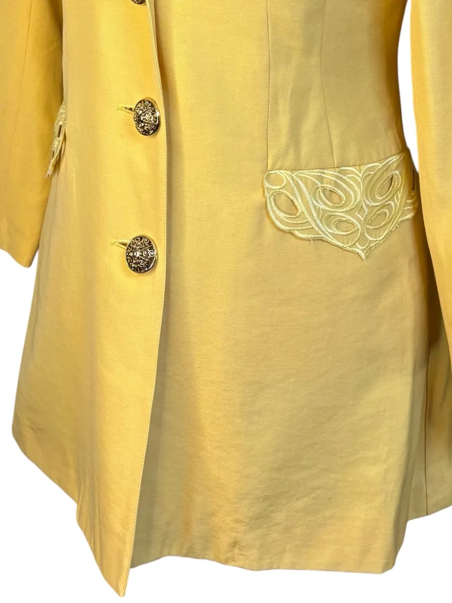 Gul längre och figursydd kavaj i härlig gul färg. Rejäla axelvaddar och fina utskurna detaljer på krage och fickor. Storlek: XS (italiensk 42) Bystmått: 45 cm Axelmått: 41 cm Ärmlängd: 56 cm Längd: 79 cm Material: 65% ull, 35% viskos Material, foder: okänt