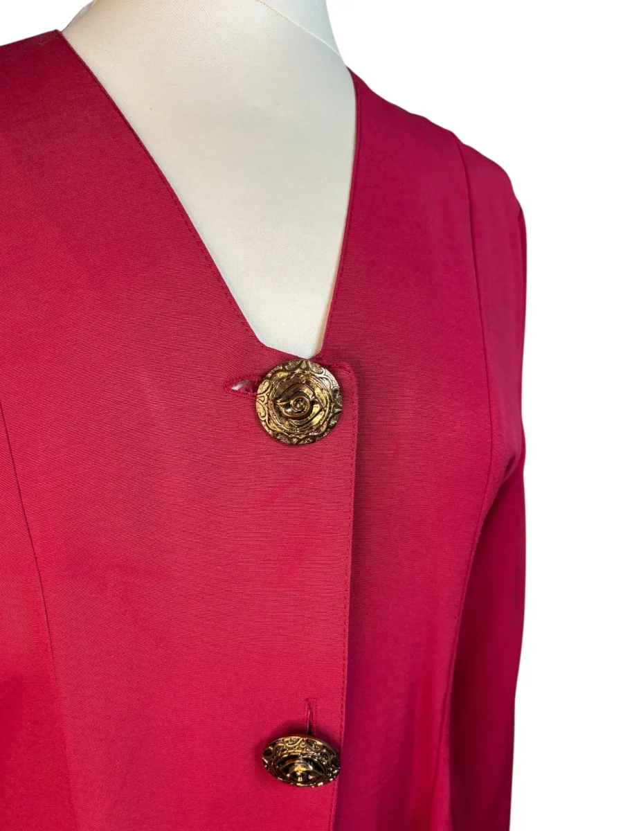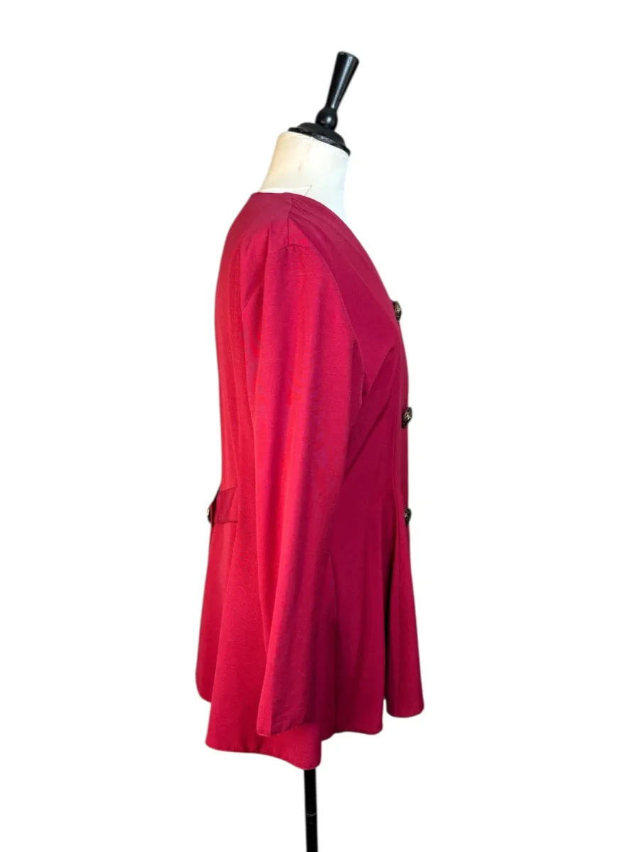90-talsblus från ”Hot Zone” by Kappahl. Hallonrosa längre blus med utsvängd nedre del. Tre stora knappar med sirligt mönster. Storlek: 38/40 (märkt 40) Bystmått: 47 cm Axelmått: 43 cm Längd: 76 cm Material: 76% polyester, 24% polyester