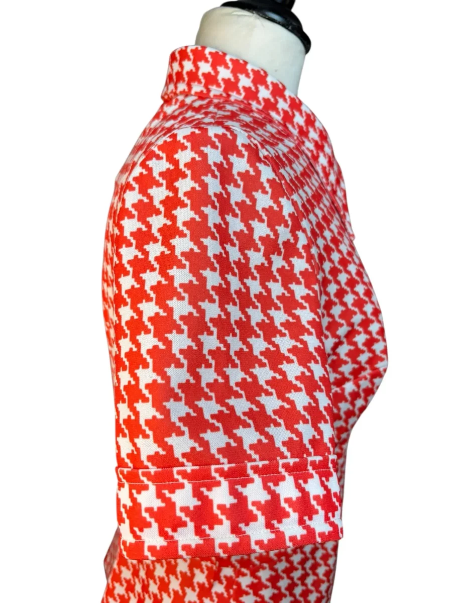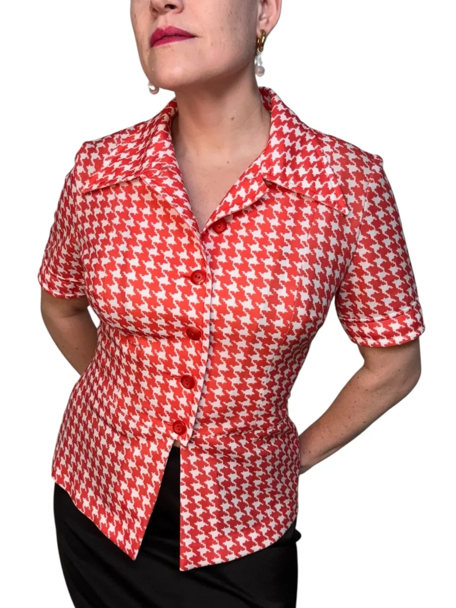 Röd och vit hundtandsmönstrad kavaj med kort ärm. Figurnära passform och 70-talssnibbar! Kan bäras lite uppknäppt med nedfälld krage eller knäppt hela vägen upp i halsen. Storlek: ca S Bystmått: 46 cm Midjemått: 78 cm Längd: 58 cm Material okänt