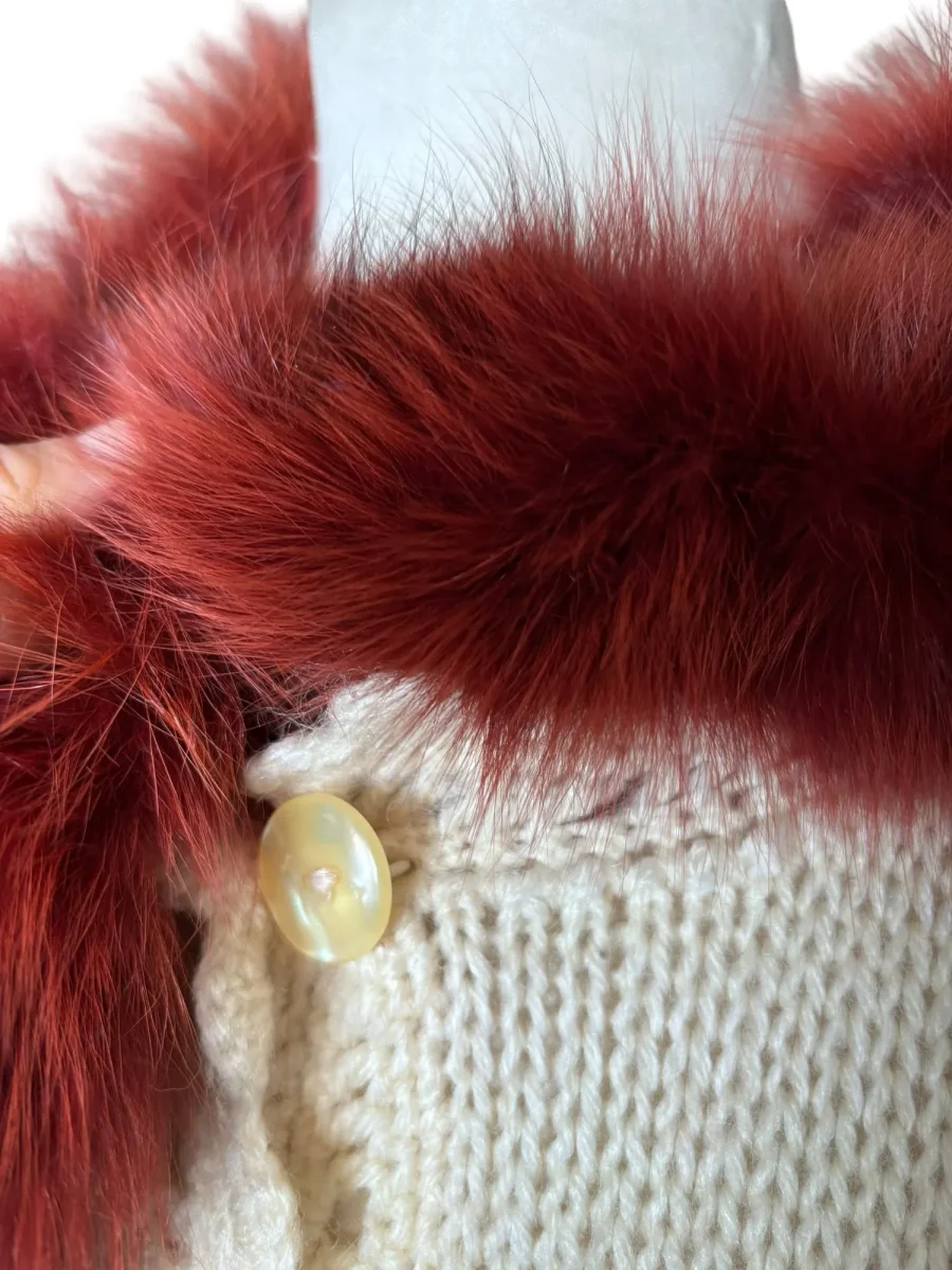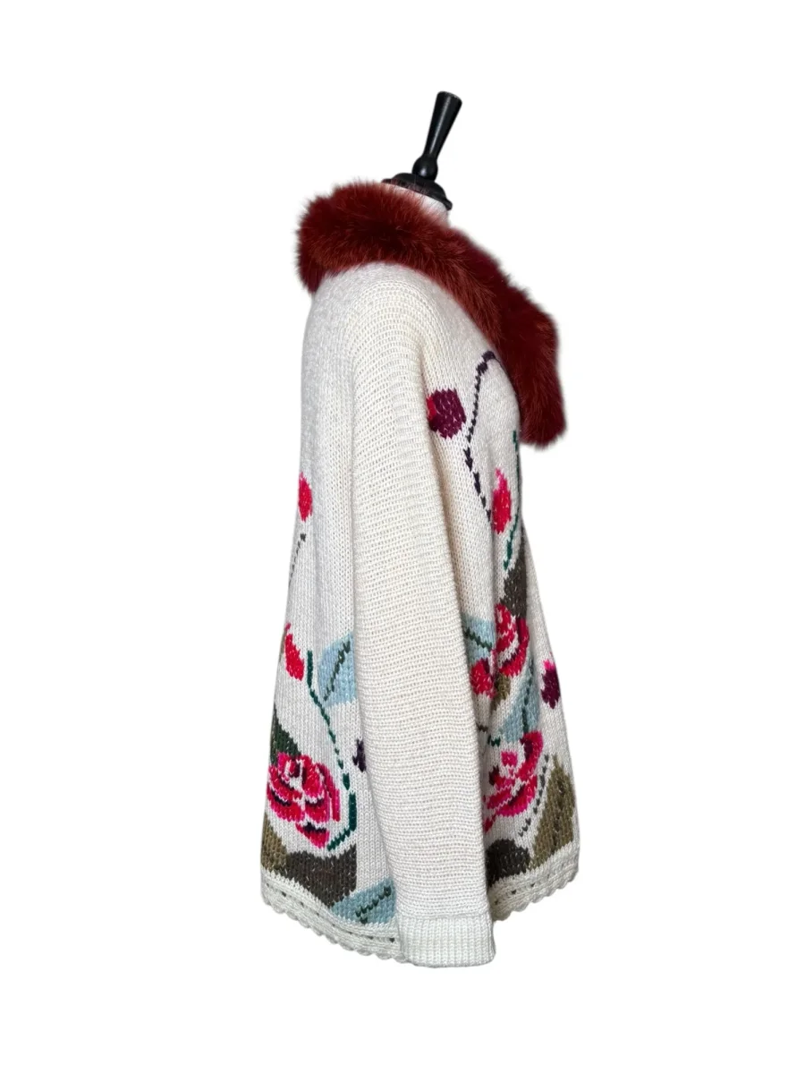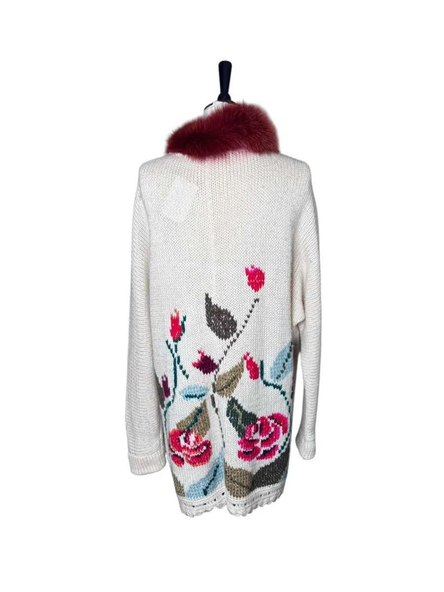 Mysig längre kofta med fint blommönster och roströd fuskpälskrage. Storlek: Ca XL (även fin att bära oversized) Bystmått: ca 70 cm Längd: 86 cm Material okänt