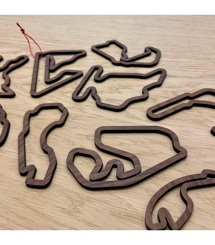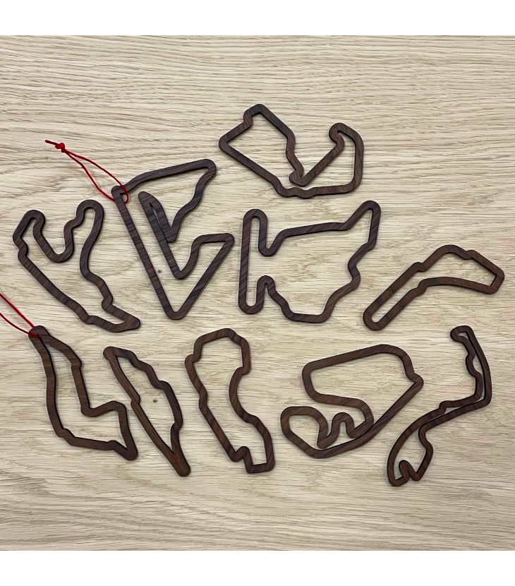 Ge din julgran ett unikt och lyxigt utseende med våra exklusiva julhängen av oljad valnöt, var och en designad med olika Formel 1-banor.