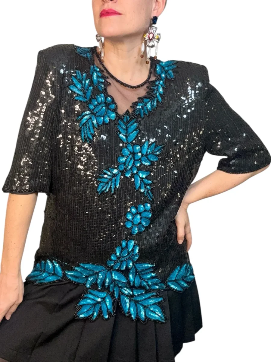 Svart paljettopp med turkosa paljetter. Meshparti i halsen och oregelbunden nedre kant ger isprincesse-vibes. Har axelvaddar. Storlek: M Bystmått: 56 cm Axelmått: 46 cm Längd: 64 cm Material: 100% silke Material, foder: 100% viskos
