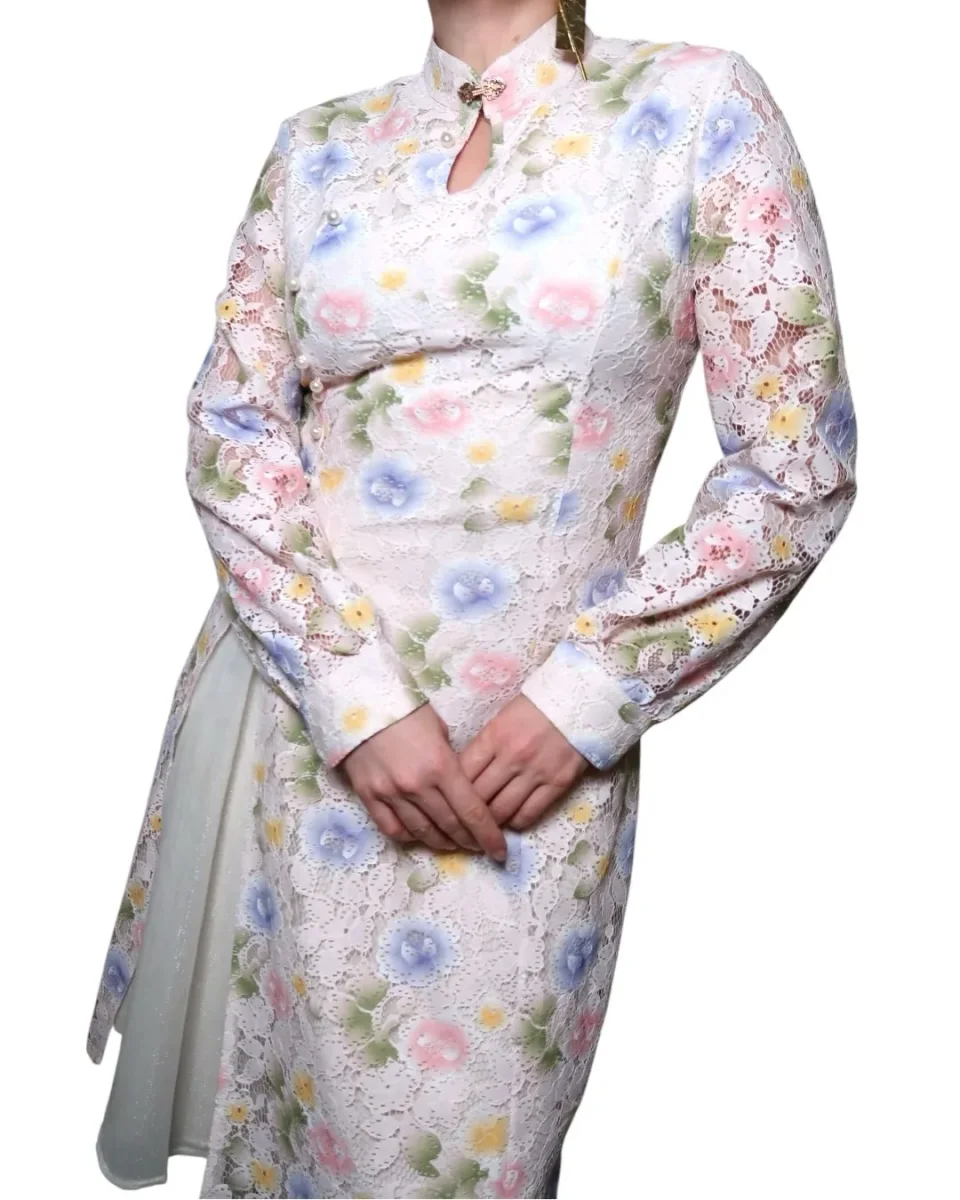 Pastellfärgad asiatisk spetsklänning. Nyckelhålsöppning i ringningen och en hög slits på sidan med vitt chiffongtyg. Klänningen är fodrad i kroppen men har genombrutna ärmar. Storlek: S-M Bystmått: 45 cm Axelmått: 40 cm Ärmlängd: 59 cm Längd: 104 cm Material: okänt