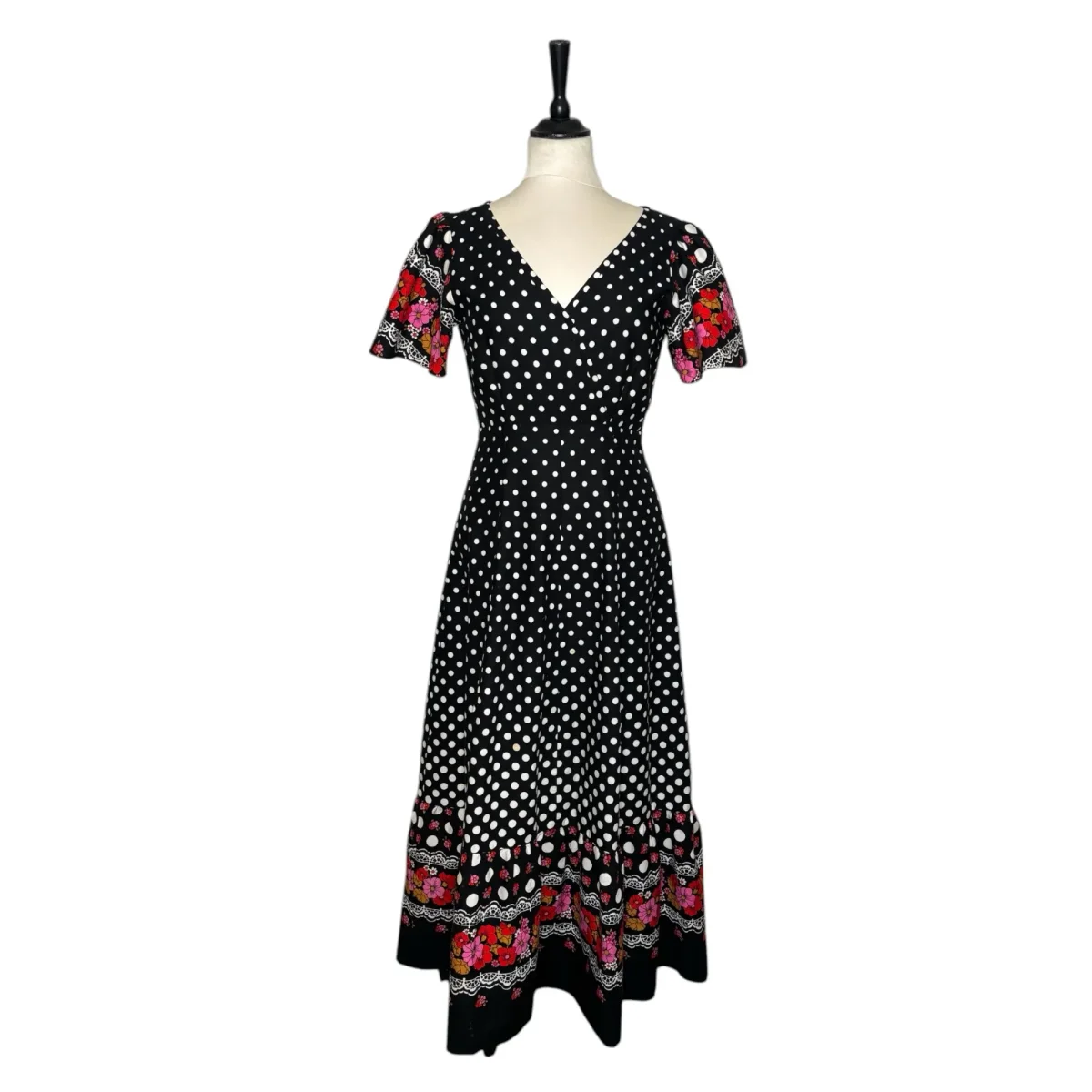 Långklänning i snygga mönsterkombinationen prickigt och blommigt! V-ringad med klockade ärmar. Storlek: S Bystmått: 45 cm Axelmått: 39 cm Midjemått: 74 cm Längd 137 cm Materiallapp saknas. Yttre tyg känns som bomull, foder okänt