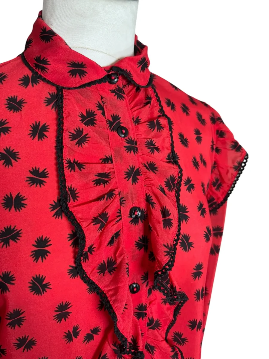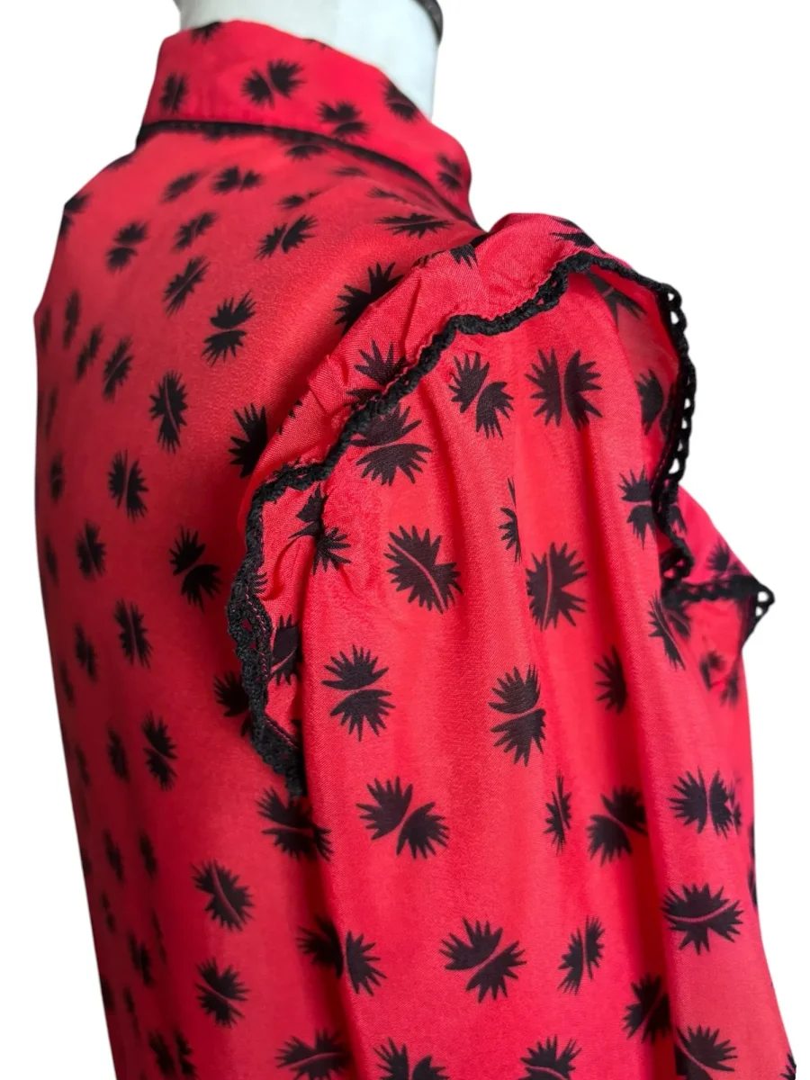 Orangeröd blus med svart mönster, Krås med svart spetskant framtill samt på axlarna. Hemmasydd pärla. Storlek: XS-S Bystmått: 50 cm Axelmått: 41 cm Ärmlängd: 63 cm Längd: 62 cm Material okänt