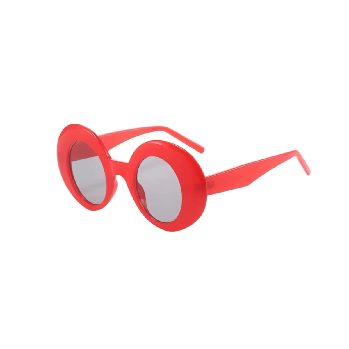 Riktigt stora och coola solglasögon med röd ram och gråsvart glas. Har UV-skydd. Bredd: 15 cm Höjd: 6,5 cm *Detta är en ny produkt