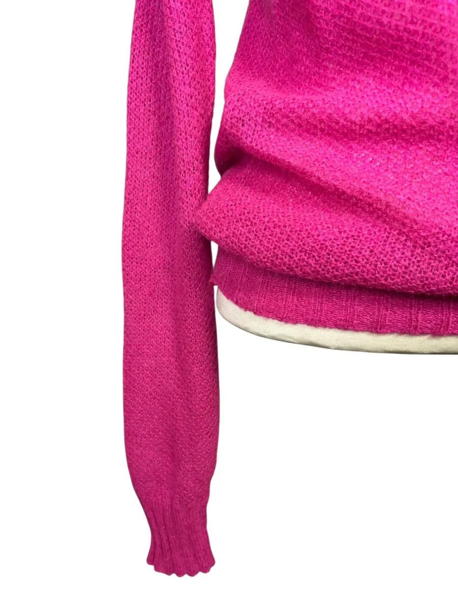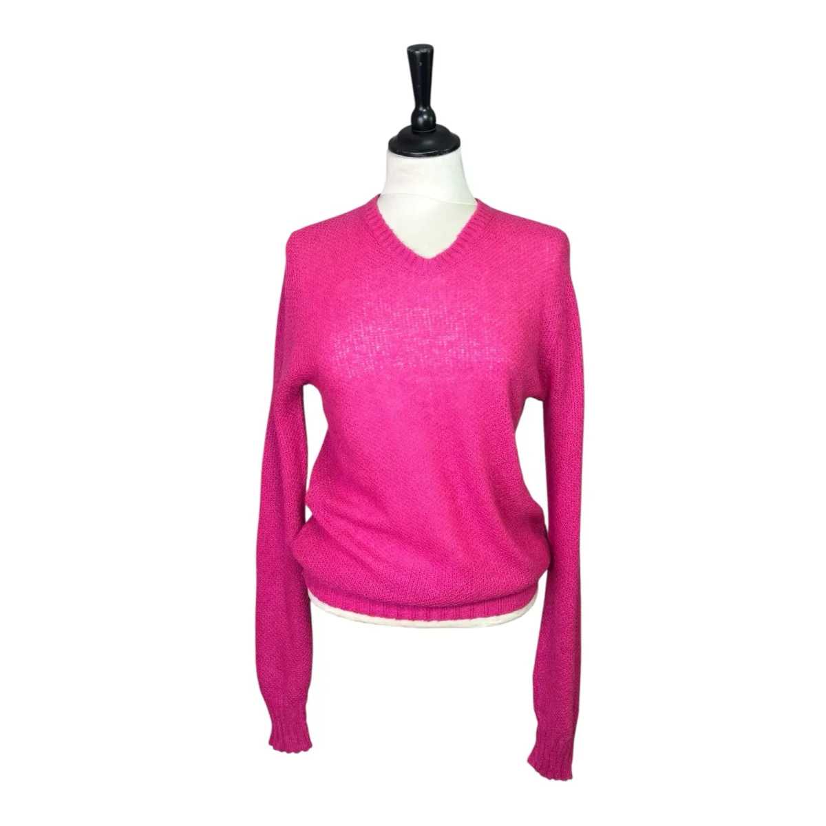 Rosa glesstickad V-ringad tröja. Riktigt långa ärmar att mysa in sig i. Storlek: XS-liten M Bystmått: 48 cm Axelmått: 43 cm Längd: 63 cm Material okänt