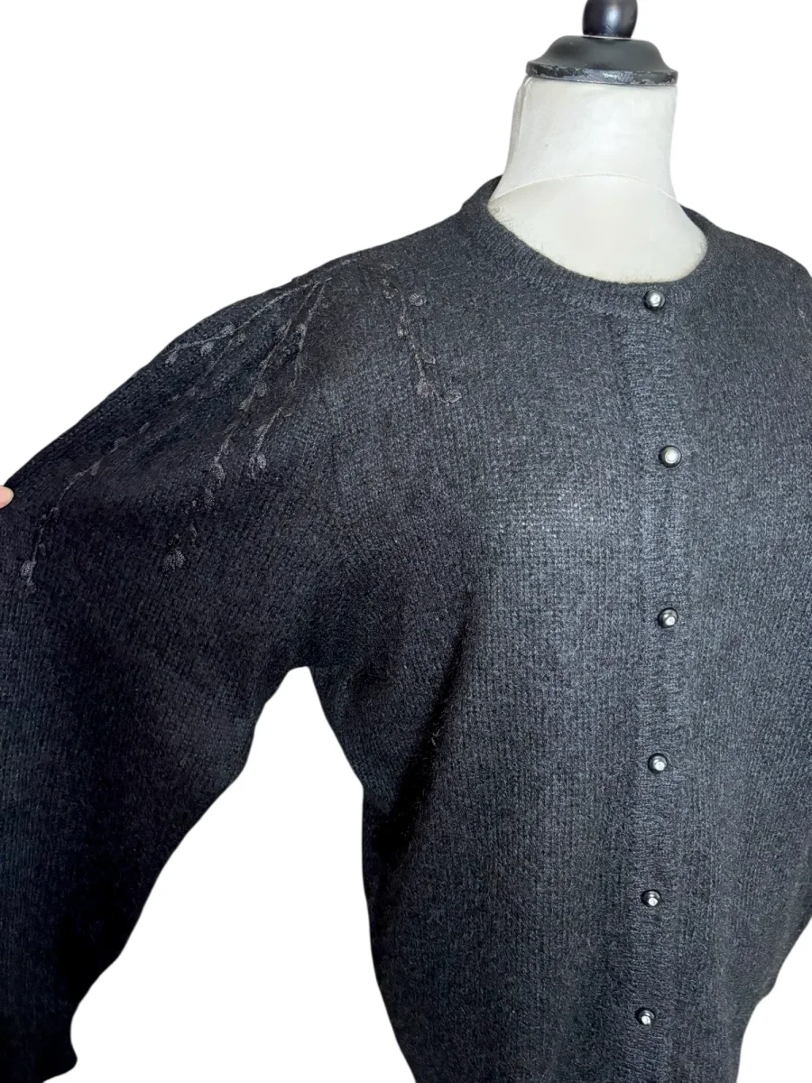 Supermysig längre kofta i mjuk mohairblandning. Liten puffaxel med svart brodyr. Storlek: ca L Bystmått: 60 cm Axelmått: 47 cm Längd: 67 cm Material: 80% super kid mohair, 20% polyamid