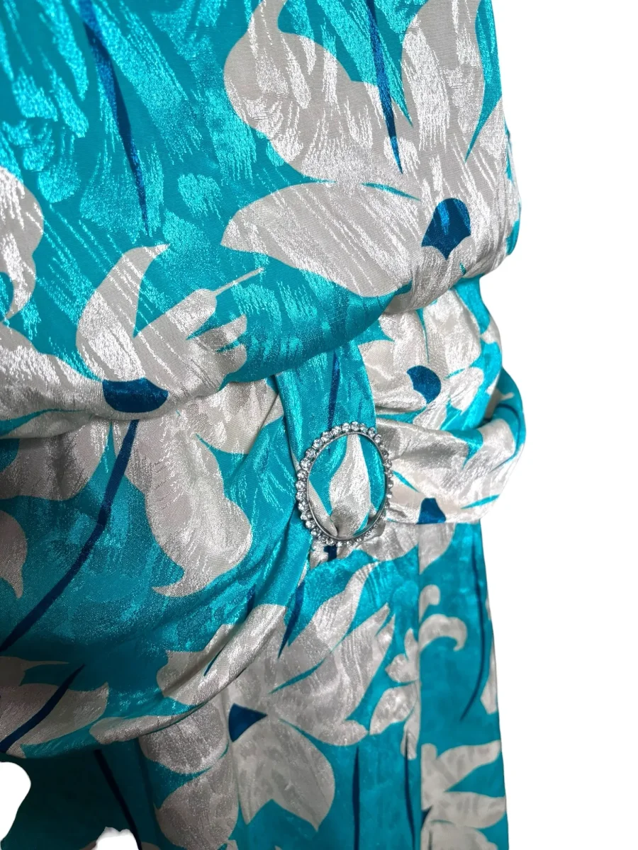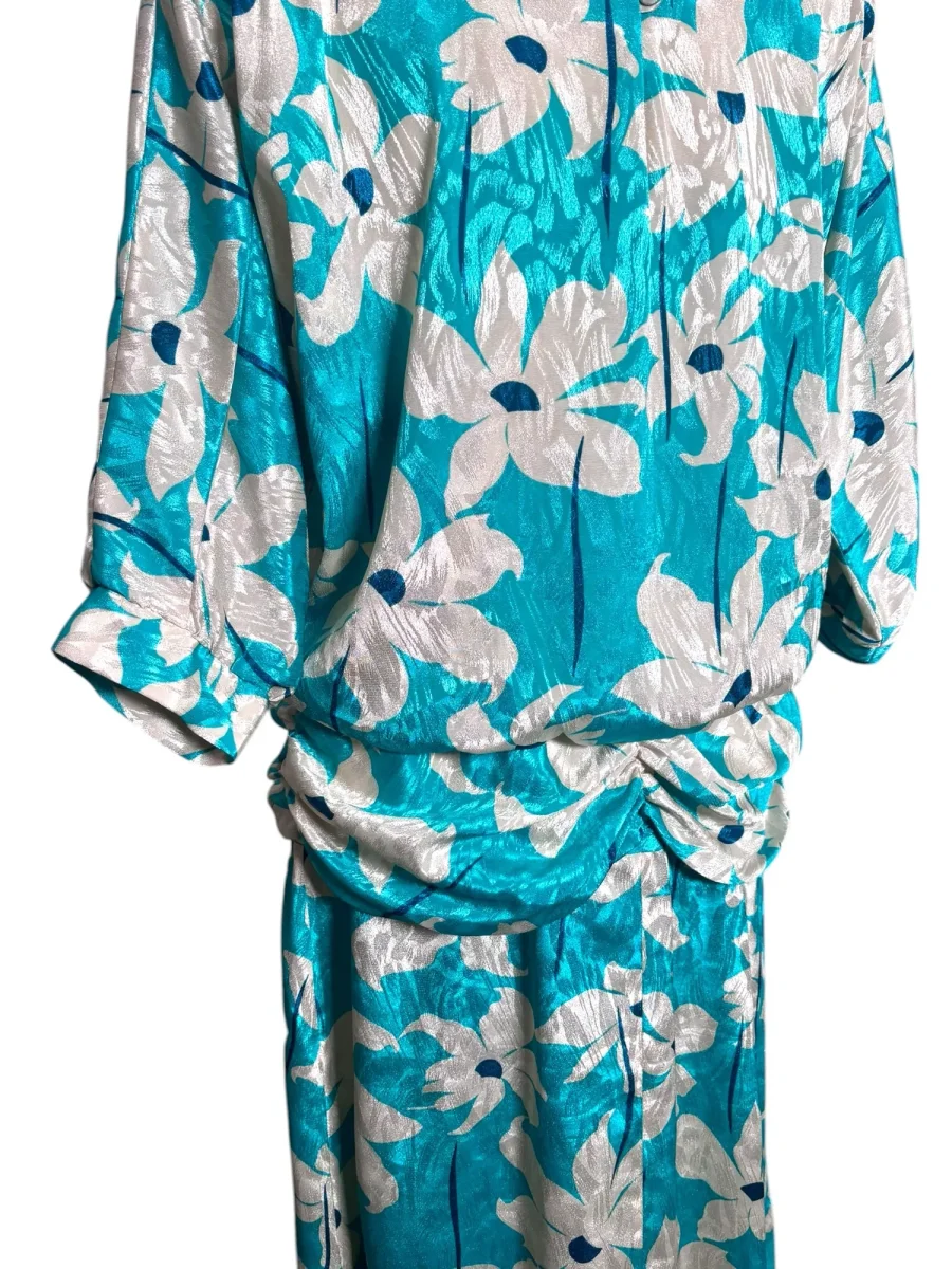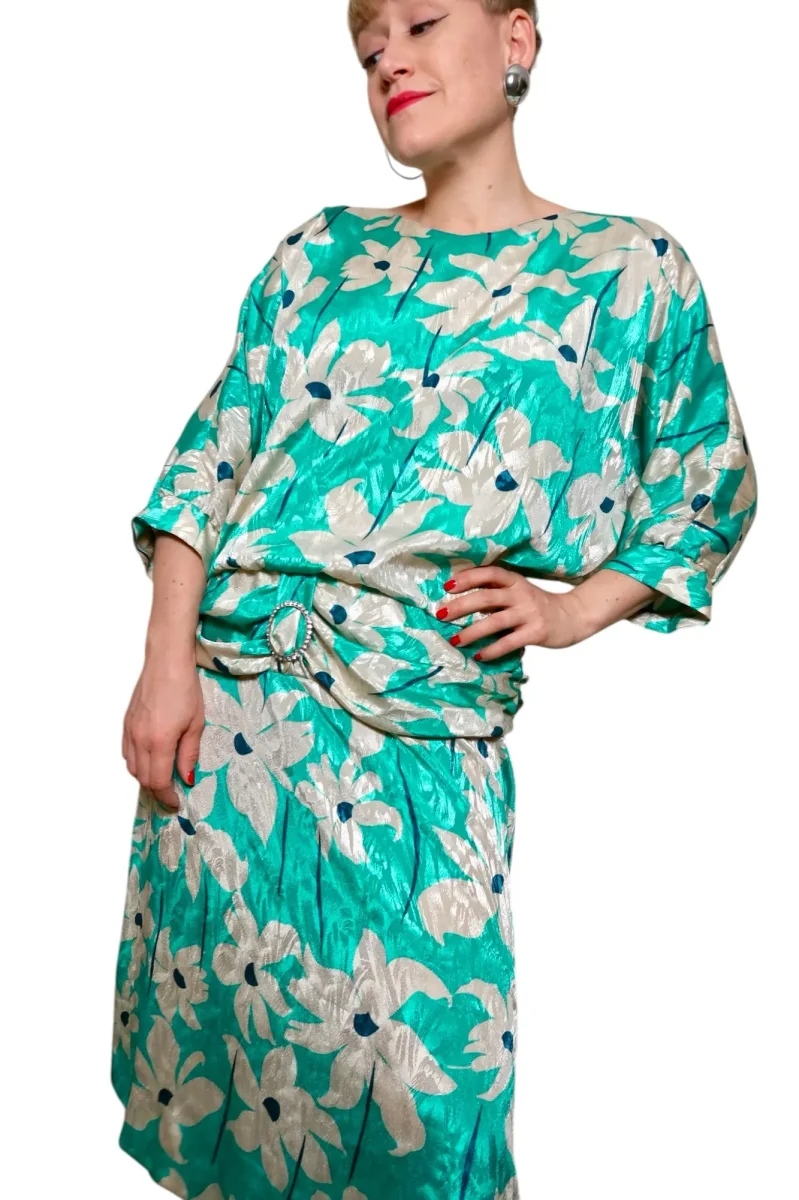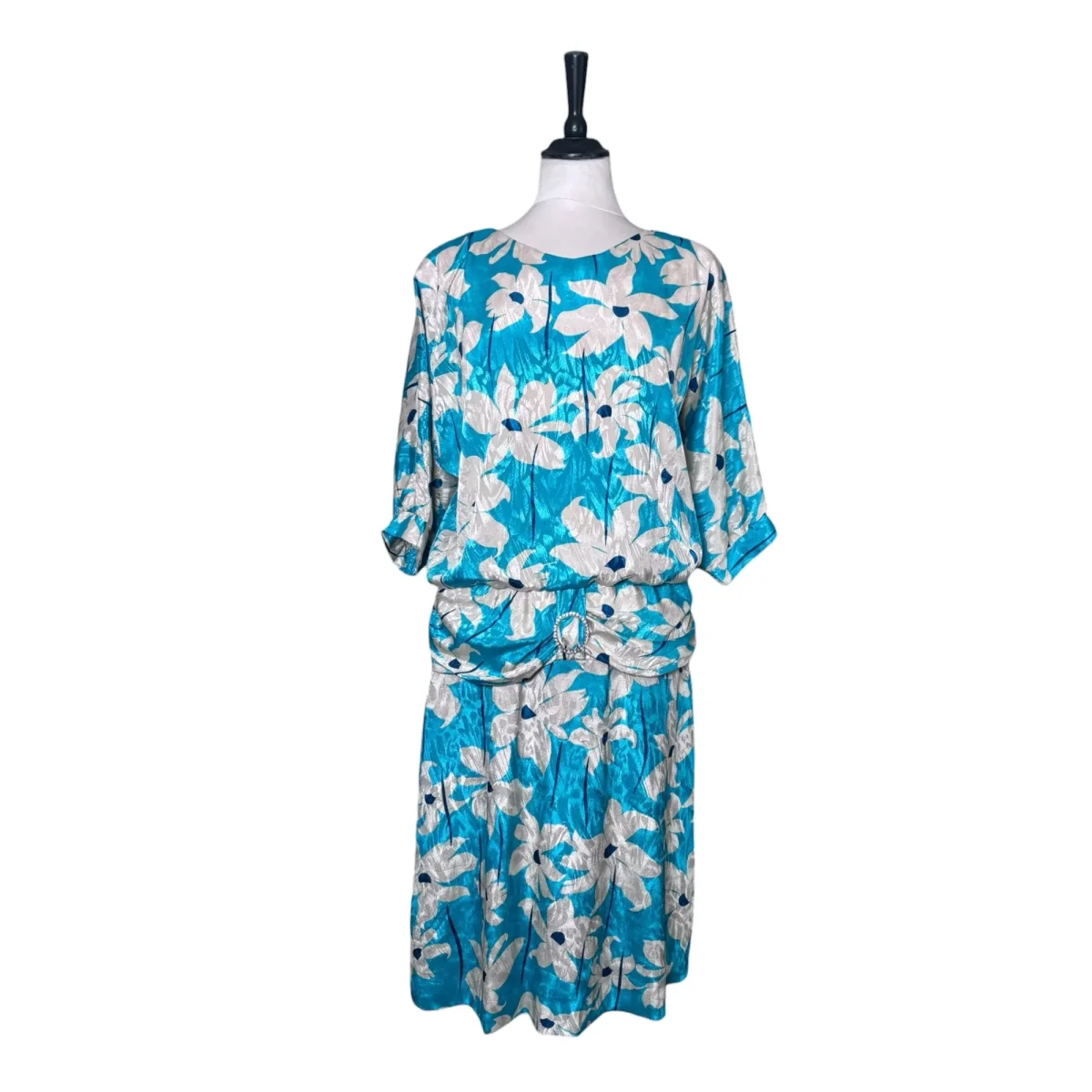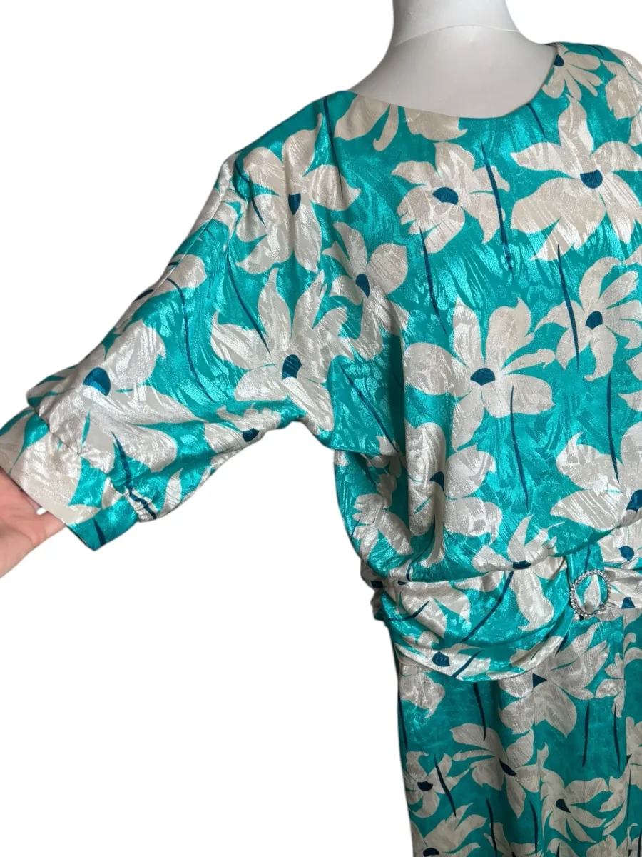 80-tals klänning i turkos och vit med blommigt mönster. Drop waist med ett silverspänne fram. Fladdermusärm i 3/4 längd. Har axelcaddar. Storlek: L-XL Bystmått: öppet Midjemått: 72-108 cm (stretch) Längd: 116 cm Material: okänt